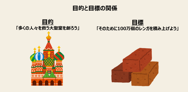 「目的」とは「実現したい内容」だが「目標」とは「目的(=実現したい内容)の到達水準」のことを指す。