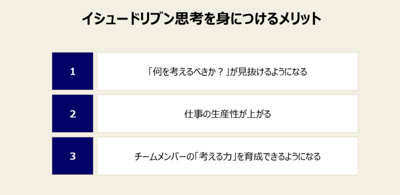 続いてはイシュードリブン思考を身につけるメリットについて解説しよう。イシュードリブン思考を身につけるメリットは大きくわけて3つある。