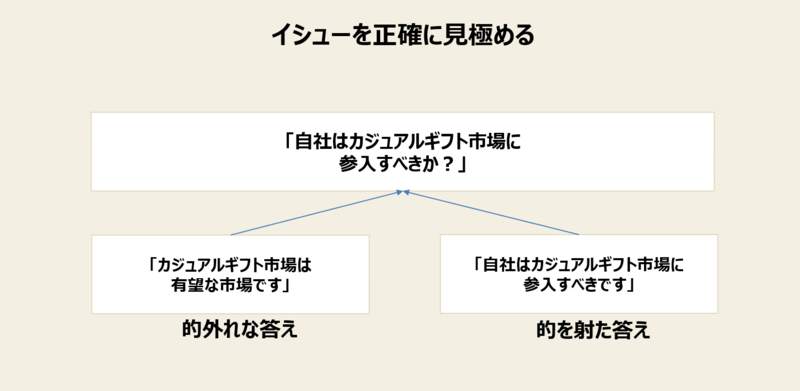 例えば先ほどの「カジュアルギフト市場の事例」でいえば、結論を出すべきイシューは「自社はカジュアルギフト市場に参入すべきか?」だ。