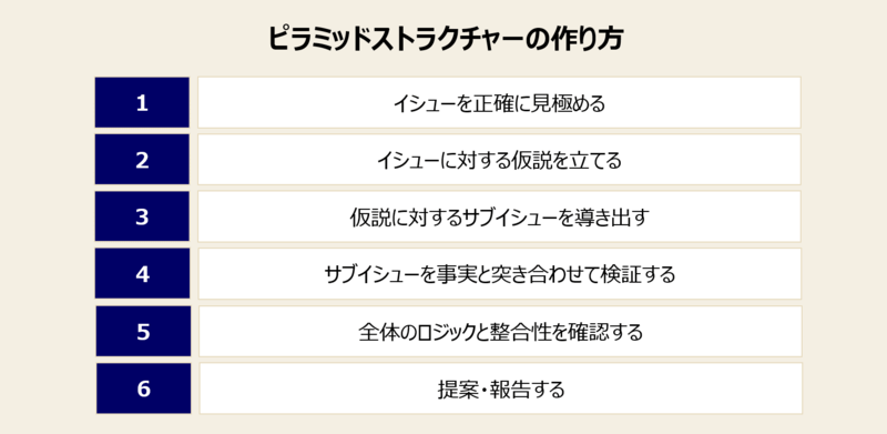 いよいよここからは、ピラミッドストラクチャーの作り方について具体例を交えて解説していこう。ピラミッドストラクチャーの作成手順は、大きくわけて6つのステップにわけることができる。
