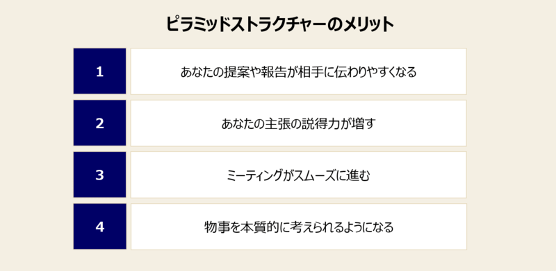 ピラミッドストラクチャーのメリットの1つ目は、あなたの提案や報告が相手に伝わりやすくなることだ。